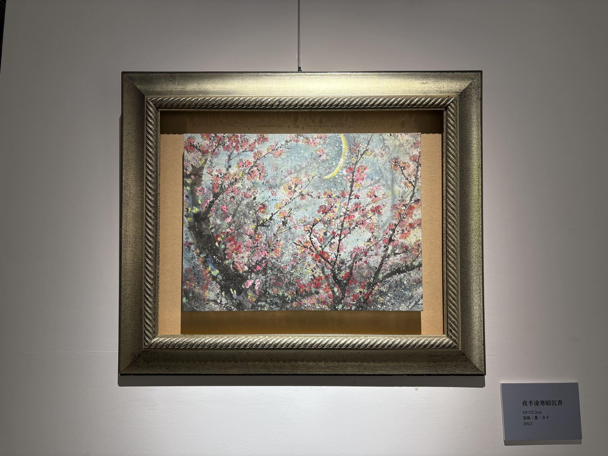展出作品〈貓的密夜〉、〈秋蓮遙對冷蒼瓊〉、〈蝶逐流〉、〈舞藝情動五月雪〉等作品遊走於物象與心象之間,以形色交織呈現意象的流動;〈夜半凌寒暗沉香〉描繪月夜中盛開的梅花,展現出堅毅的生命力與清雅的氣質;〈國土之殤〉、〈變色國土〉、〈花蓮馬太鞍溪颶風驟雨記痕〉、〈堰塞湖之懼〉等作品紀錄自然災害帶來的衝擊,將環境的變動轉化為深刻的視覺藝術。