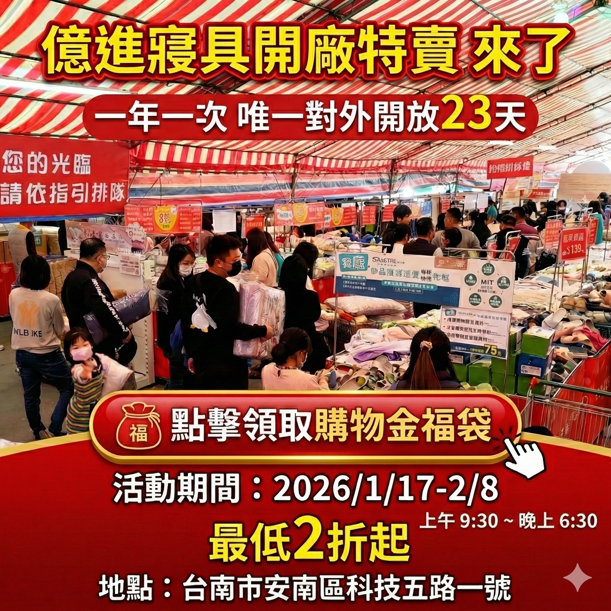 億進寢具2026年廠拍1/17-2/8正式開跑。#留言處有好康。
